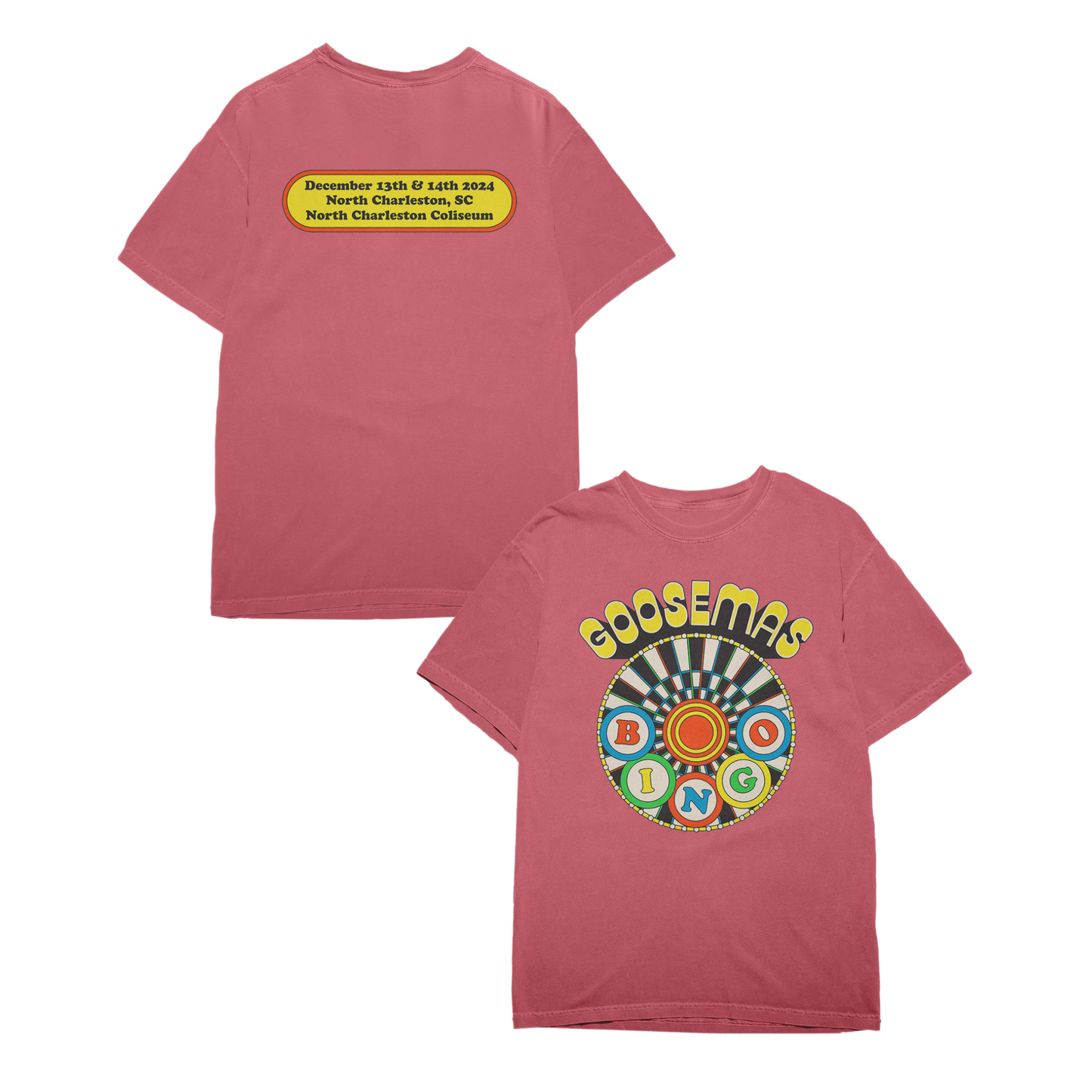 "Bingo Wheel" design printed on a 100 percent cotton crimson t-shirt.