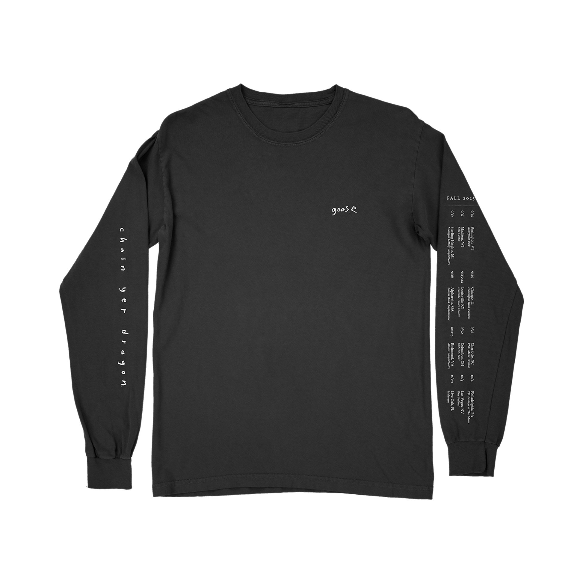 "Goose" logo printed on the front left chest with a "CYD Collage" design printed on the back and fall 2025 tour dates on the sleeve of a long sleeve black 100% cotton t-shirt.
