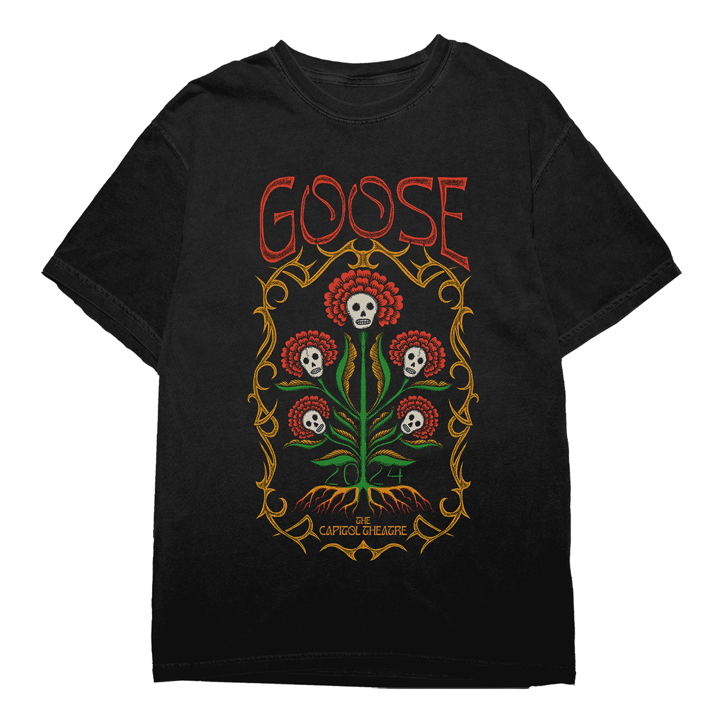 “Skull Flowers” design from Goose’s April 2024 run at the legendary Capitol Theatre in Port Chester, NY. Printed on a 100 percent cotton, garment-washed black tee. Limited quantities remain.