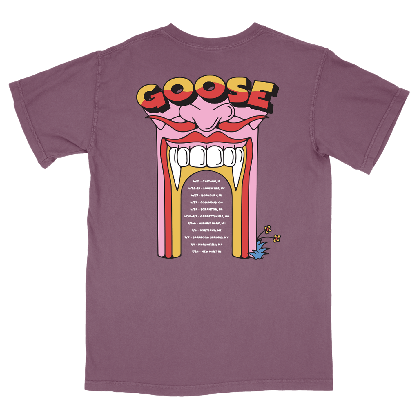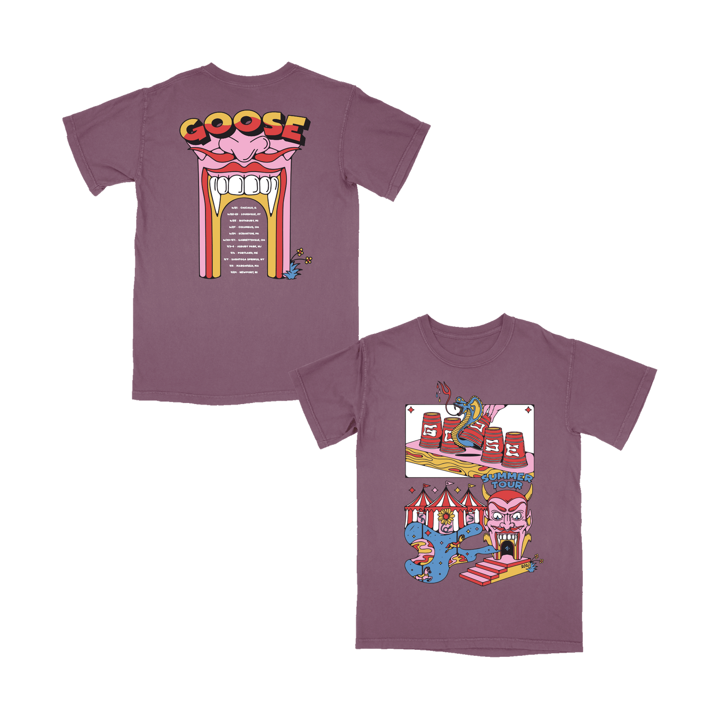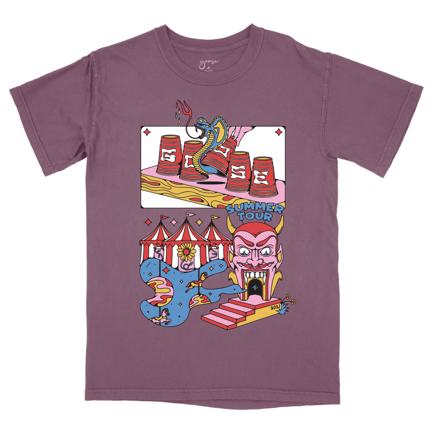 "Summer Circus" design screenprinted on the front and back of a Berry-colored garment-dyed t-shirt. Features tour dates from June and July 2023.