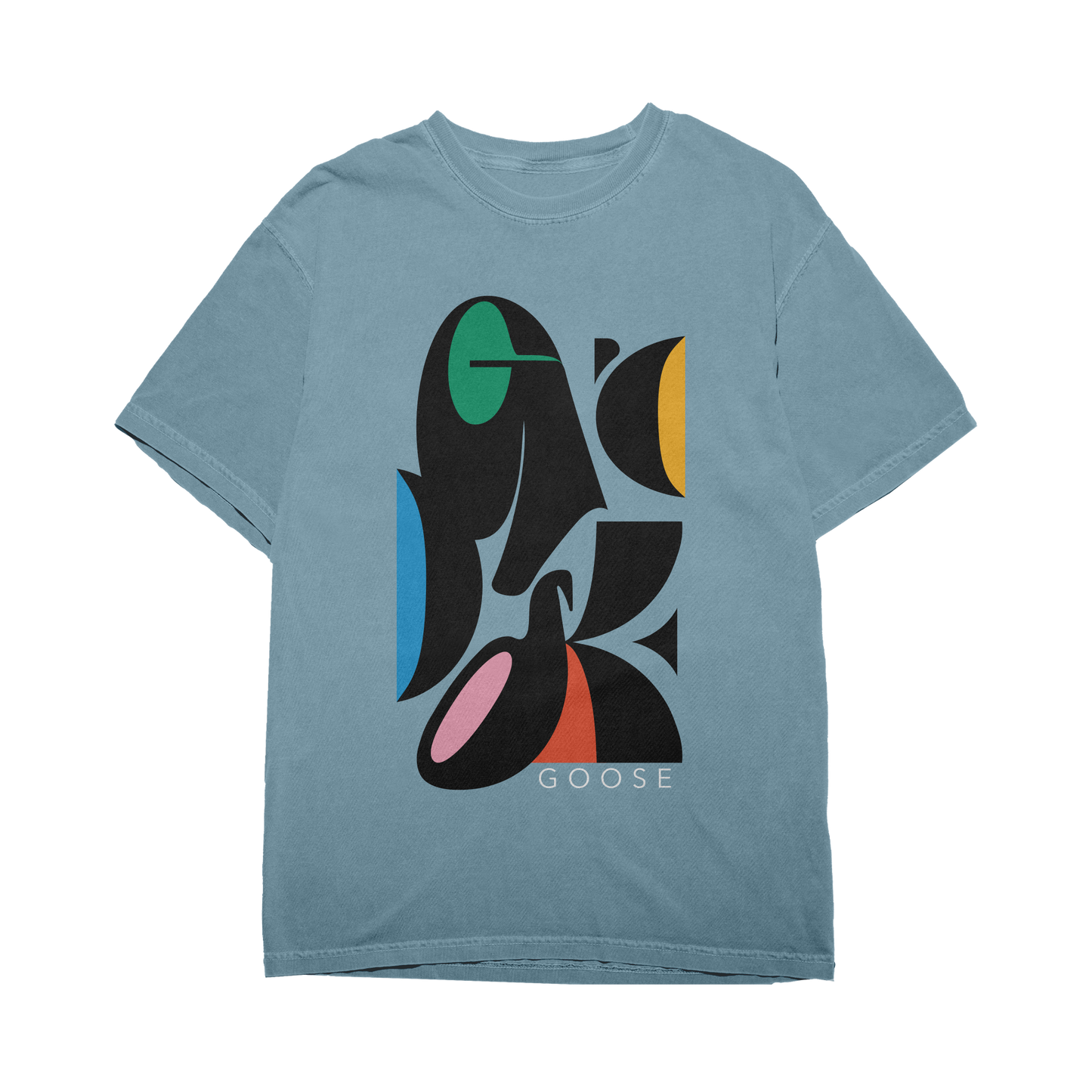 "Warp Spheres" design printed on a 100 percent cotton blue t-shirt.
